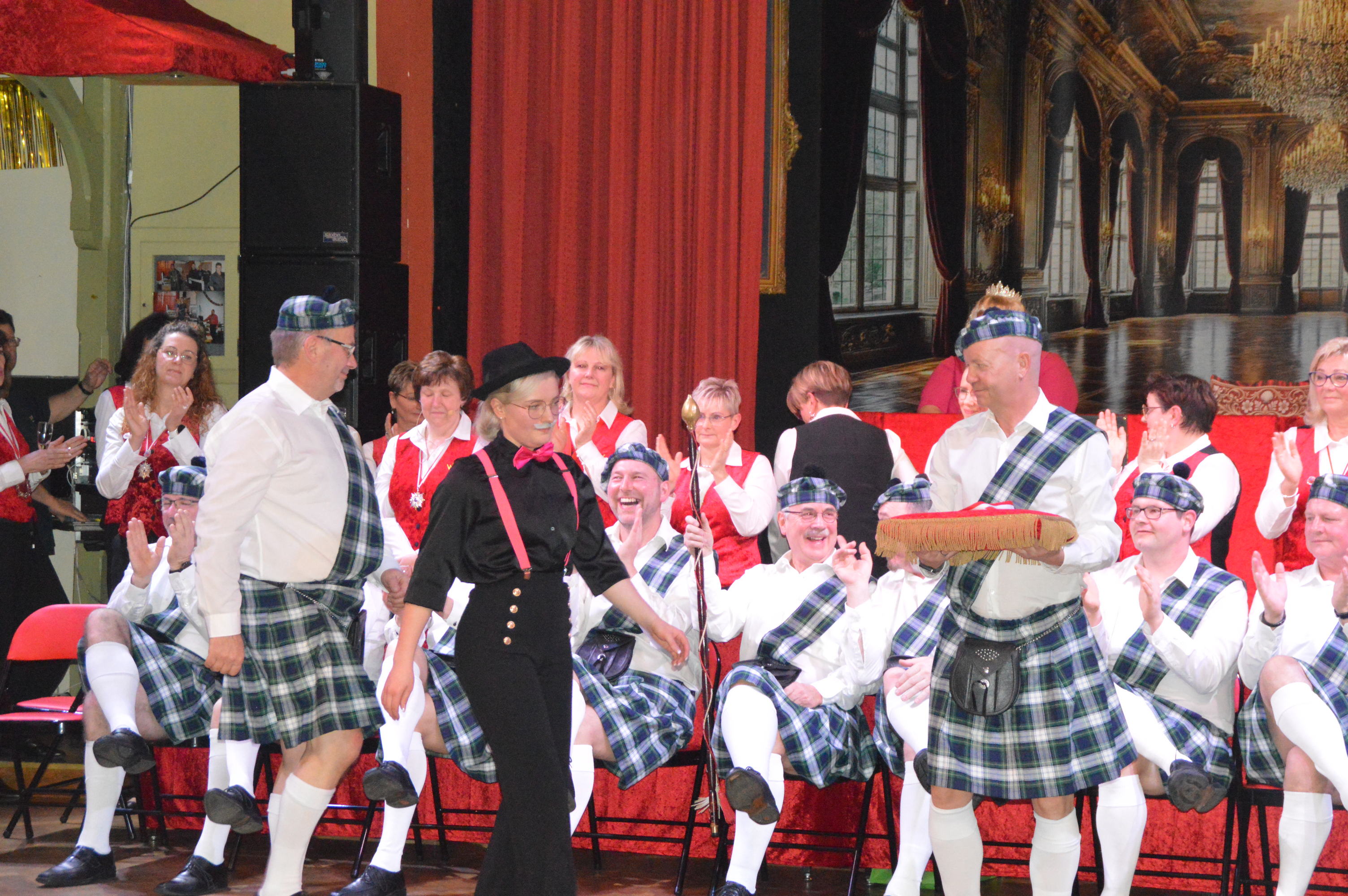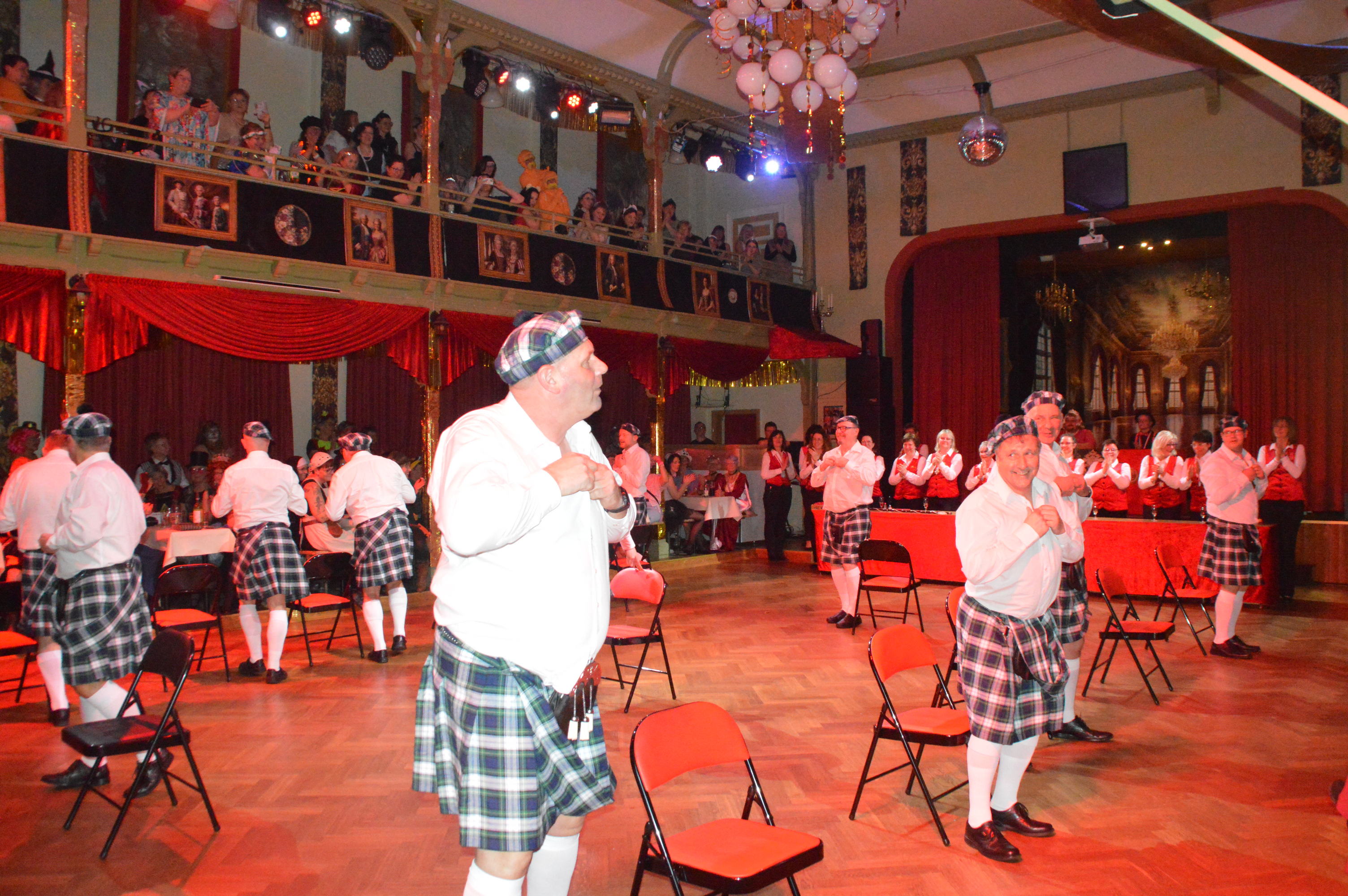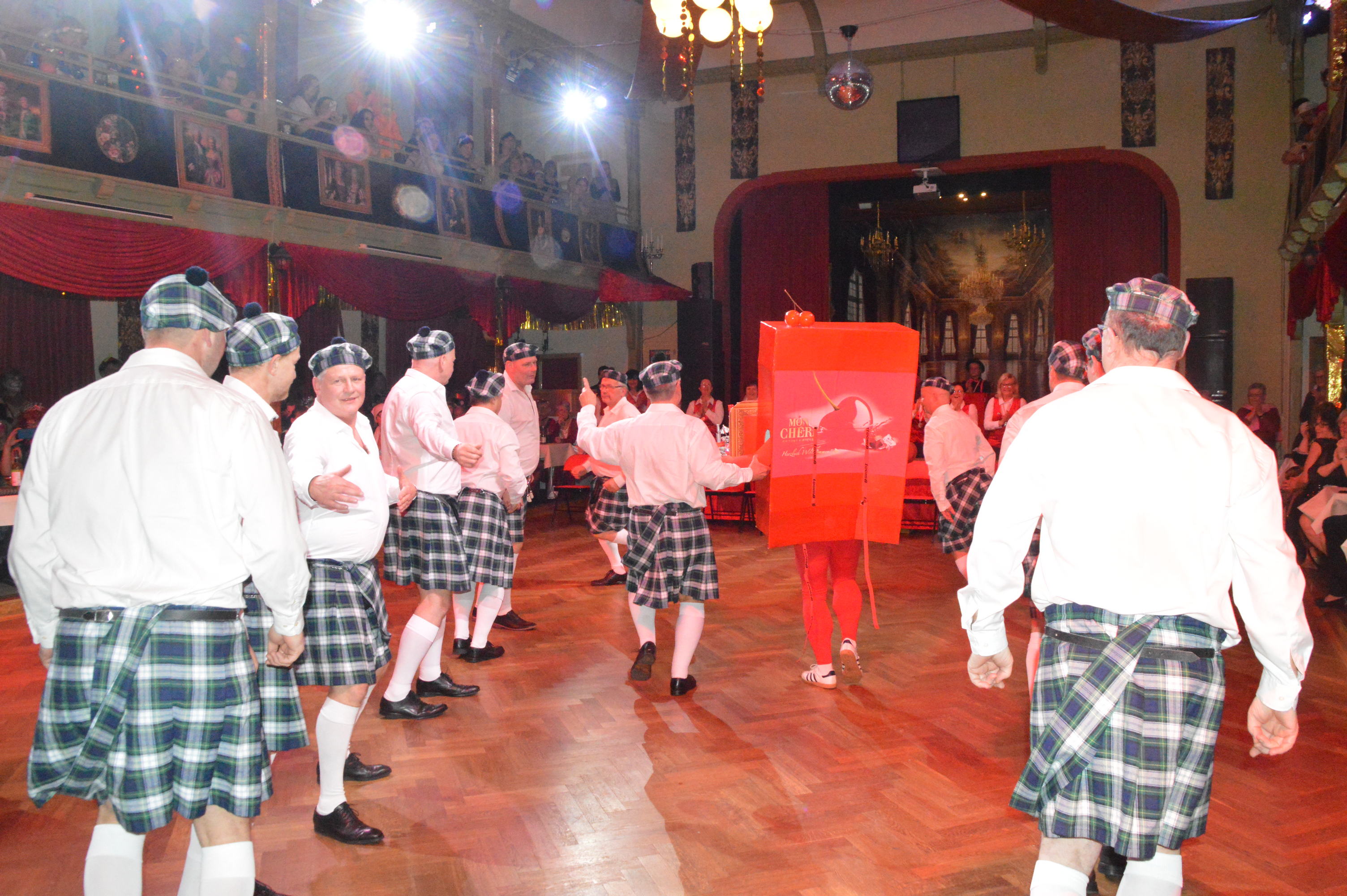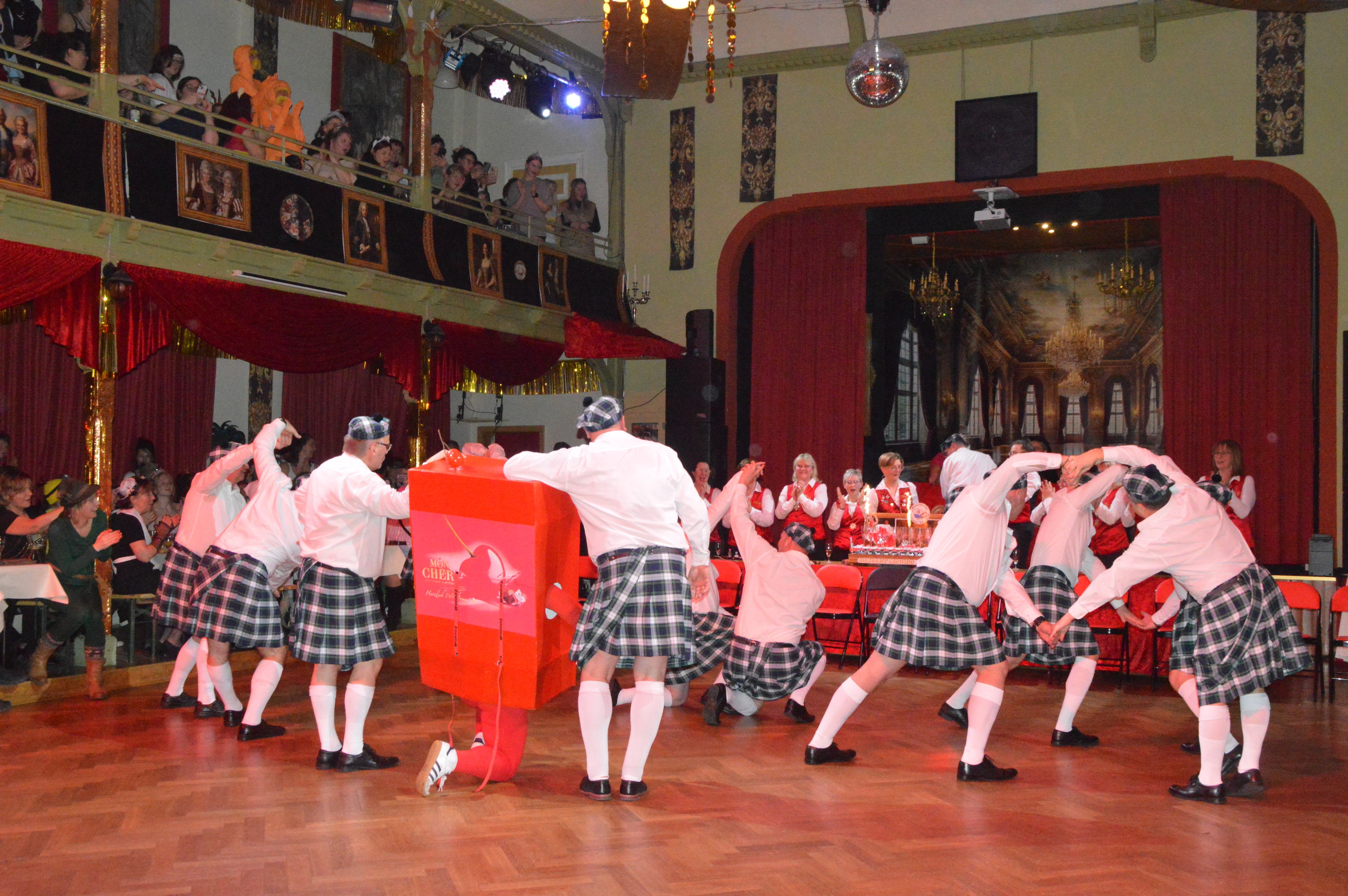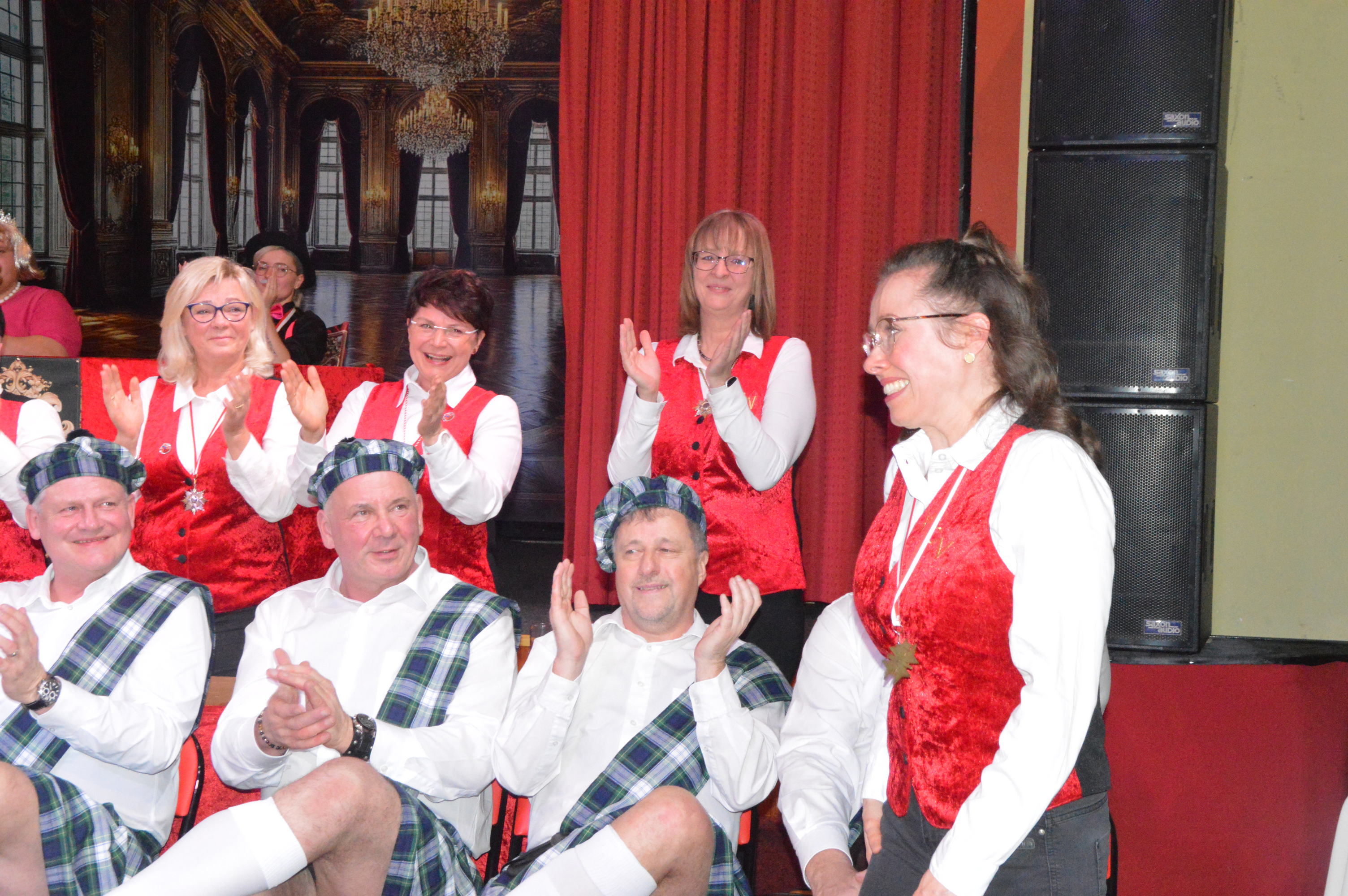 Danach startete das Männerballett als Schottentruppe ihren Tanz. Der war gut und es gab auch viel Beifall dafür. Doch dann kam erst der eigentlich Auftritt. Zum Titel "Mon Cherie"wurden tatsächlich für viele Besucherinnen Mon Cherie auf den Tischen verteilt. Natürlich bekam unser weiblicher Elferrat davon auch eine gehörige Portion ab.