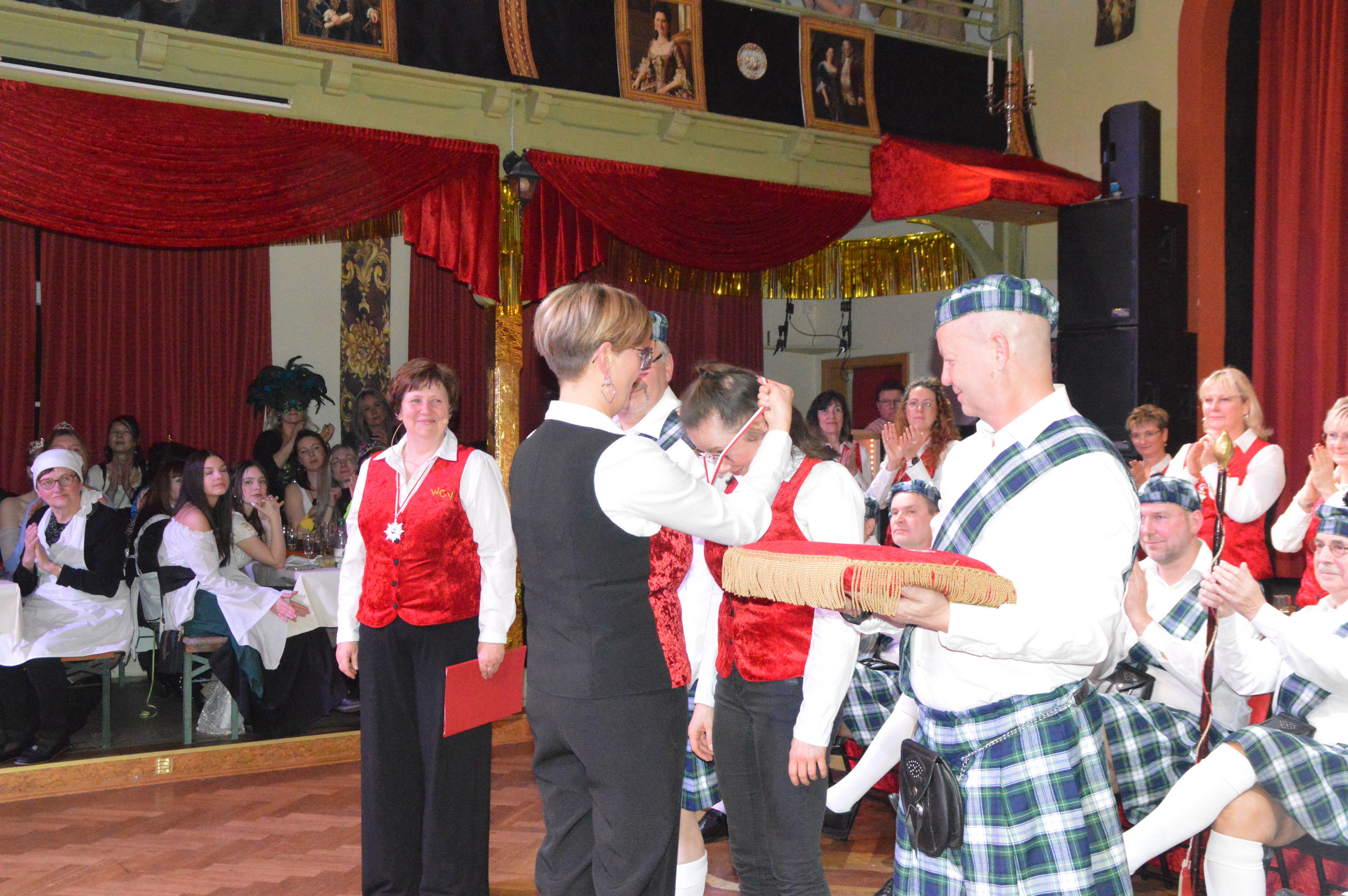 Prinz Nino erhielt natürlich auch den Prinzenorden der 55. Saison überreicht. Danach hatte Martina Theuer ihren großen Auftritt. Nachdem sie im vergangenen Jahr beim Weiberfasching das Großkreuz des weiblichen Elferrates bekommen hatte, war es nun ihre Aufgabe, die Laudatio für die neue Großkreuzträgerin zu verlesen. Die bisherigen Großkreuzträgerinnen hatten in einer geheimen Sitzung beschlossen, dass Jessica Pester für würdig befunden wurde, diese Auszeichnung zu bekommen.